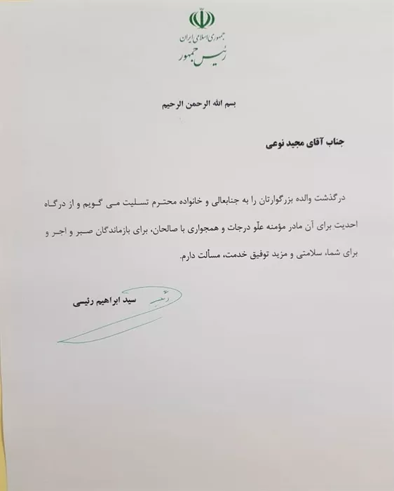 در پی در گذشت والده مکرمه مهندس مجید نوعی ریاست صندوق آینده ساز، دکتر رئیسی ، رئیس جمهور کشورمان پیام تسلیتی صادر کردند