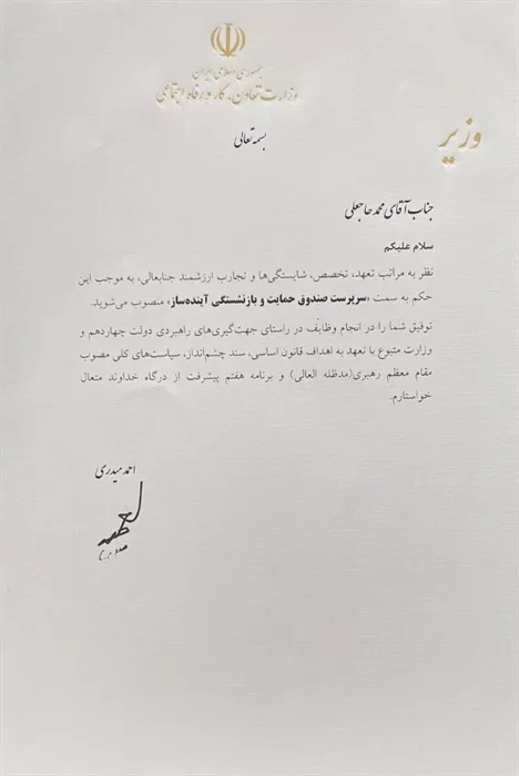با حکم دکتر میدری  وزیر تعاون ، کار و رفاه اجتماعی دکتر محمد حاجعلی سرپرست صندوق آینده ساز شد