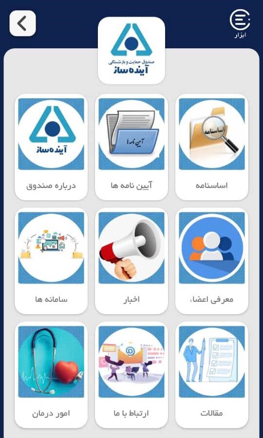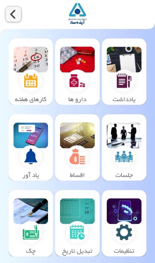 آیکون ابزار از بخش هایی شامل : یادداشت، داروها، کارهای هفته، جلسات، اقساط، یاد آور، تبدیل تاریخ و چک تشکیل شده است.