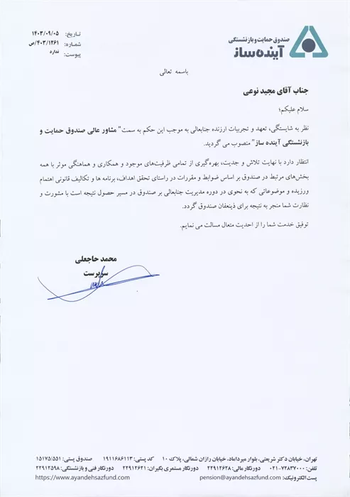 با حکم دکتر محمد حاجعلی سرپرست صندوق آینده ساز، مهندس مجید نوعی مشاور عالی مدیر عامل صندوق  آینده ساز شد.
