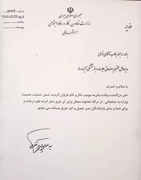 در پی در گذشت والده مکرمه جناب آقای نوعی مدیر عامل صندوق آینده ساز دکتر مرتضوی وزیر محترم تعاون ،کار رفاه اجتماعی با صدور پیامی این مصیبت وارده را تسلیت گفتند.