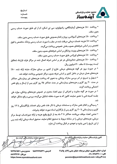 پرداخت خسارات درمانی: حداکثر ۳۰ روز کاری برای هزینههای غیر بیمارستانی و ۴۵ روز کاری برای هزینههای بیمارستانی پس از ارائه مدارک. امکان پیگیری و اعتراض: بررسی پروندههای درمانی در کمیته فنی، با حضور نماینده کانون بازنشستگان.